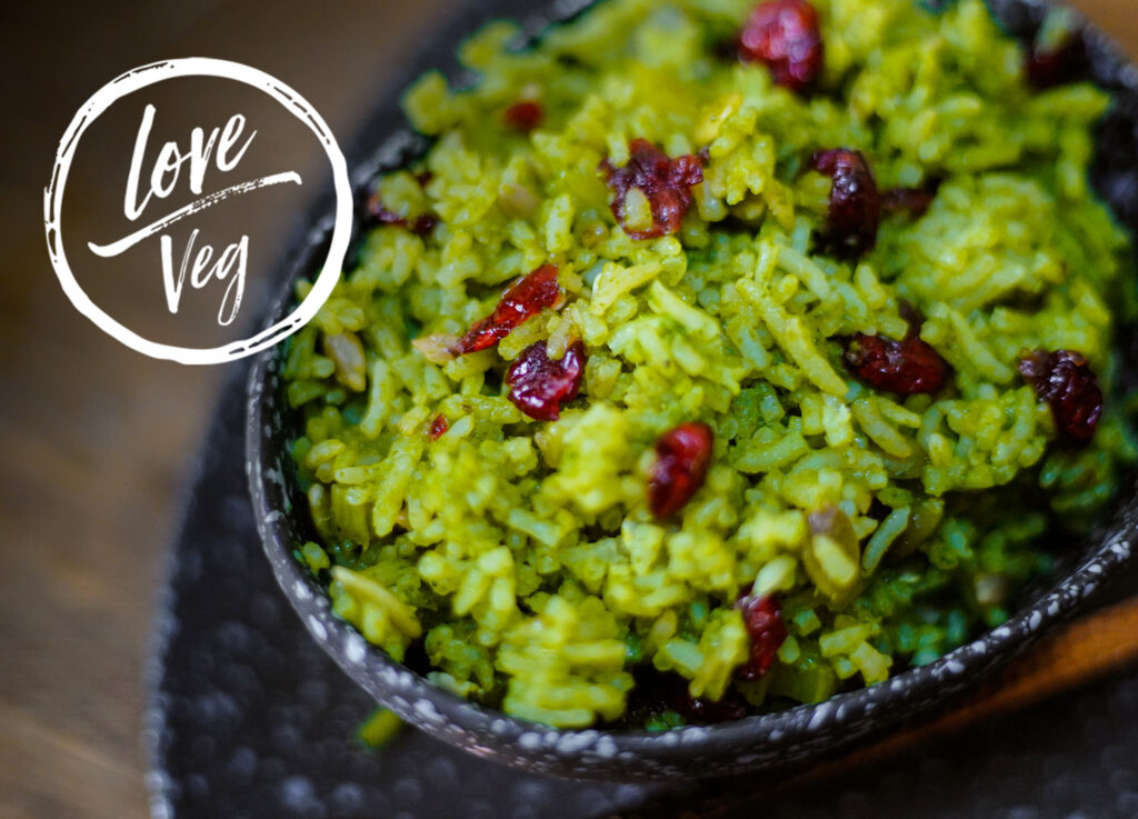 Deixe o arroz de molho em água quente por 10 minutos, escorra e reserve, bata por 1 minuto no liquidificador o alho, o espinafre, o coentro, o caldo de legumes e 2 xícaras de água. Reserve.