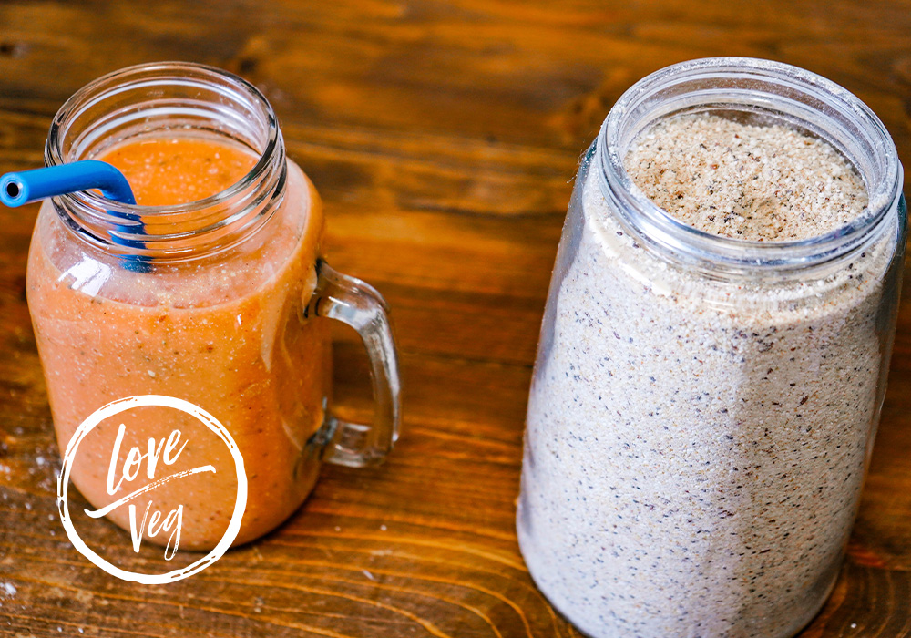 Use de três a quatro colheres em cada vitamina. Você pode usar água ou leite vegetal de sua preferência e adicionar de 1 a 2 frutas da estação.